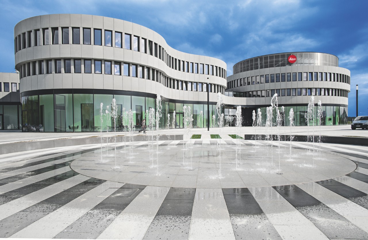 Az épület ívelt homlokzata a fényképezőgép lencséinek formáját idézi. Két henger alakú tömeg alkotja az épület főbejáratát – a körkörös részletek bent is folytatódnak, automatikusan felidézve a látogatóban a Leica lencséit és gyűrű formájú termékeit.