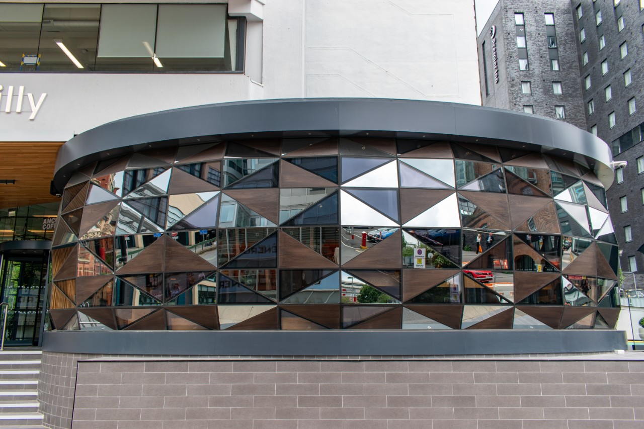 A The Gem homlokzati üvegszerkezete fényvisszaverő felületként működik, és üveg, rozsdamentes acél és tölgyfa furnér kombinációját használja fel, ami bőséges mennyiségű természetes fényt juttat a belső terekbe.